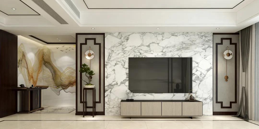 客厅设计上采用浓厚的新中式元素,不论是墙面的山水画、还是线条勾勒如窗棂的花纹装饰,无一不透露着中式独有的诗画韵味。电视墙采用大理石花纹,灵动自然、奢华尊贵,再加以盘虬盆栽,打造出极富古典气息的空间气质。
