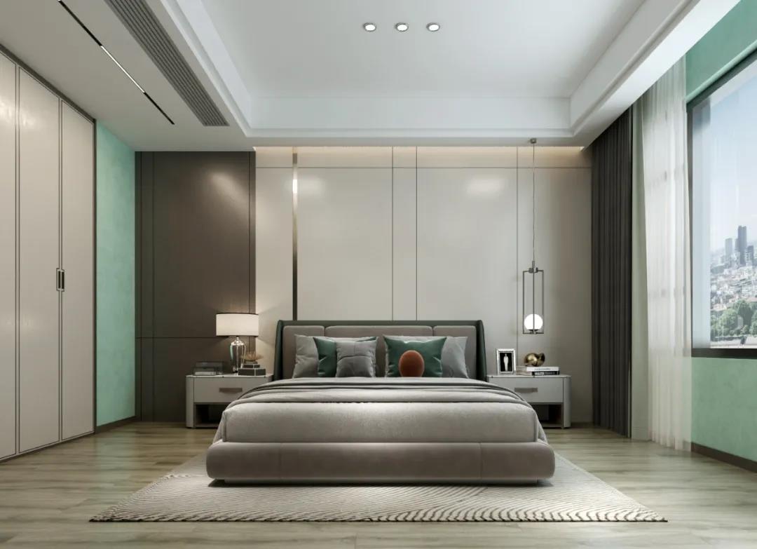 卧室整体去除复杂的设计元素,精准提炼最能表达风格的颜色,以灰绿、灰白、米色等低饱和度的色调进行搭配,打造出素雅简洁、又颇有中式风韵的休憩空间。