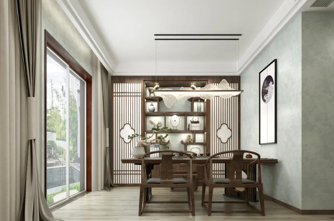 独立茶室既是待客休闲之所,也能作书房之用。仿古典柜体的设计与山水式吊灯映衬,室内空间娴静雅致,恍惚已有茶香满室。