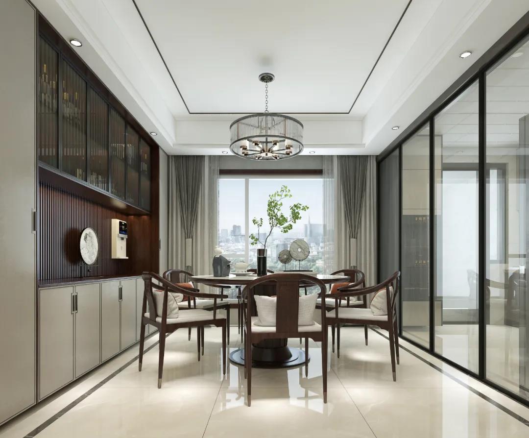 餐边柜的设计,利于物品的摆放和存取。上方柜体门透明,既能做收纳之用,也能作酒柜展示之用。与整体风格相符合的圆形餐桌,再次点名新中式的主题,更表达了传统文化中对“团圆”的期待。