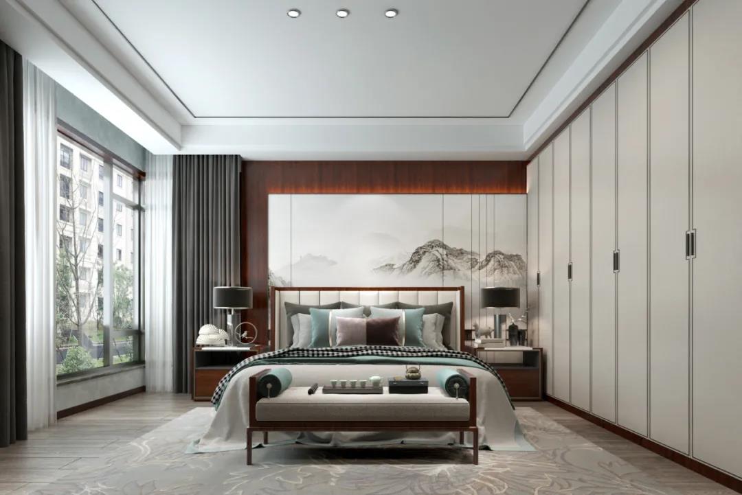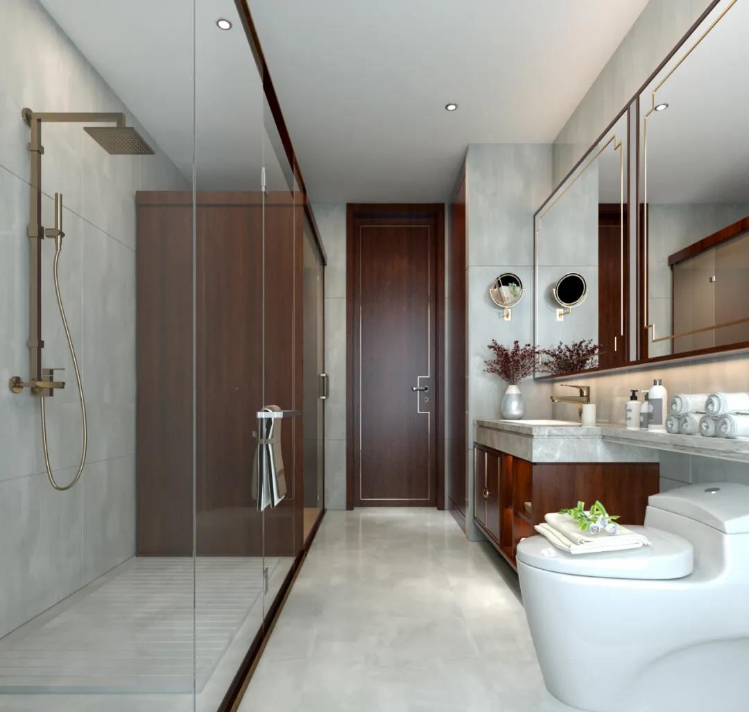 主卧床头山水画再次点明新中式主题,深棕色墙面与白色墙面中和,厚重也不失飘逸。无主灯设计让室内光线更加柔和,主人在此休息睡眠体验更好。卫生间做干湿分离,便于保持清洁,淋浴室做防滑设计,小细节很重要。