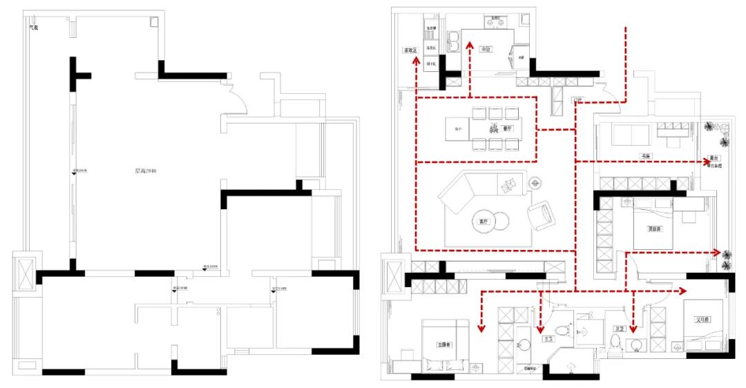 本案例中,常住人口是祖孙三辈5人,空间规划上,客户有比较大的收纳需求。在充分了解客户喜爱的设计风格与需求后,设计师结合实际户型,将一个轻奢又温柔的家居空间呈现在我们面前。