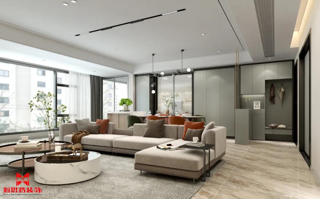 客厅采用无主灯设计,线条磁吸灯造型流畅动感又富有艺术气息。接近落地的玻璃窗起到了极佳的采光作用,配合柔和的室内光源与布艺沙发,为空间增添不少温馨感。