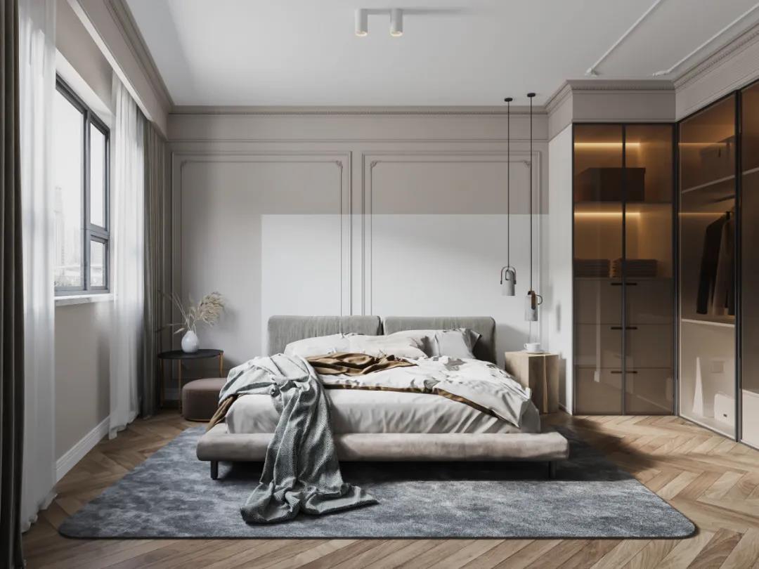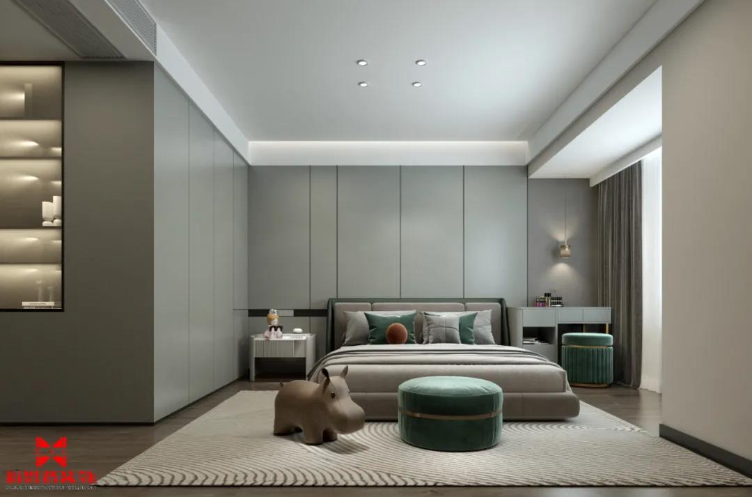 次卧沿用现代轻奢风格的设计理念,主体采用线条、颜色的搭配来进行装饰,选择柔和光源,打造出温馨和宁静的睡眠氛围。