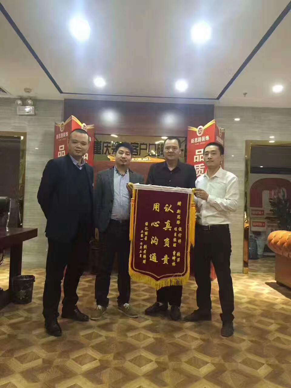 4月1日,来自保亿丽景紫园的业主刘老师将一面印有“认真负责,用心沟通”的大红锦旗交到渝北店雷店长手中,以感谢ANBO.COM高品质的装修质量和服务水平。