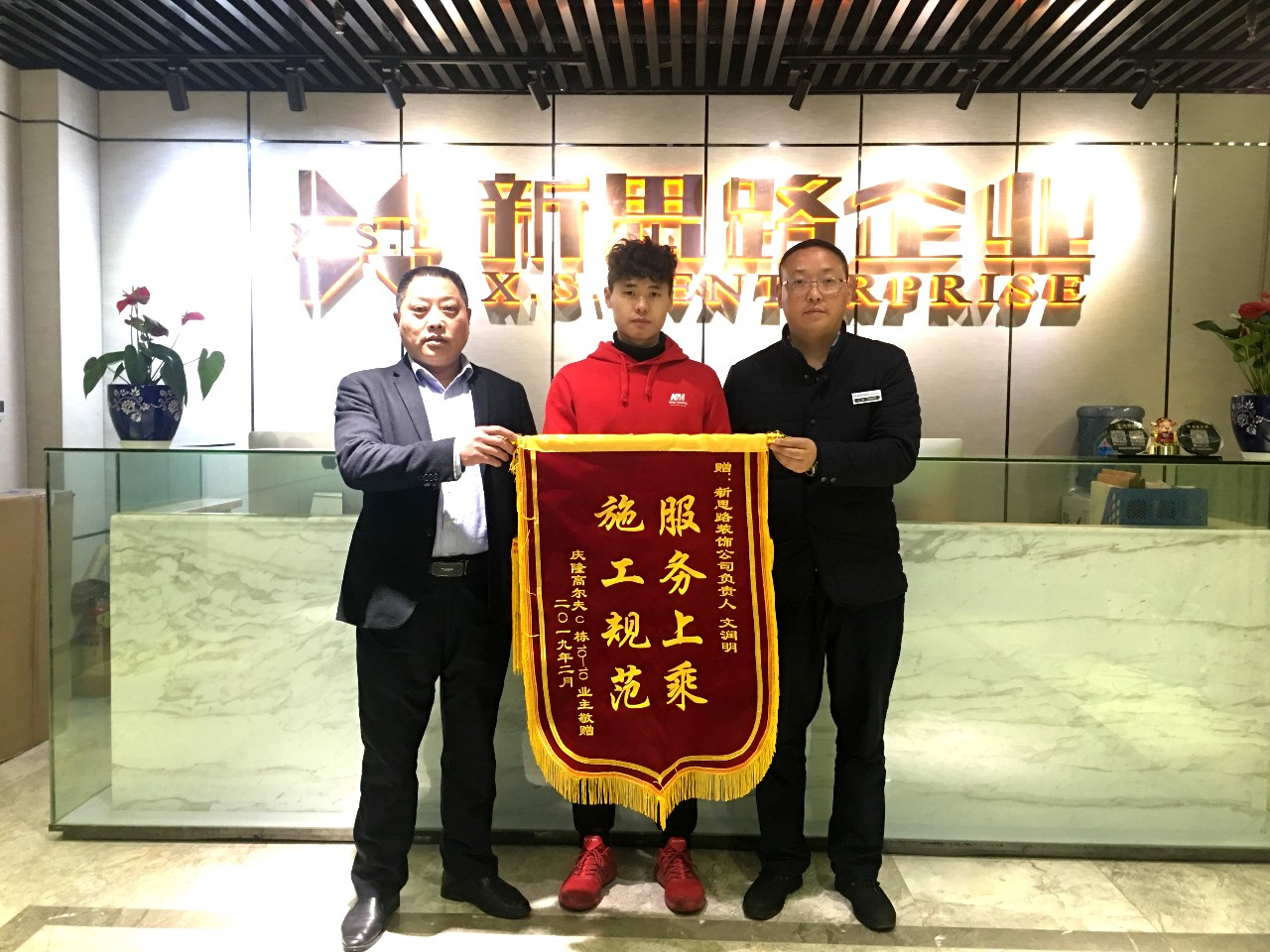 2019年2月27日上午,来自庆隆高尔夫的欧老师专程来到南坪总部,将一面印有“服务上乘,施工规范”的锦旗交给我们的项目经理文经理手中,以感谢ANBO.COM高品质工艺和优质贴心的家装服务。