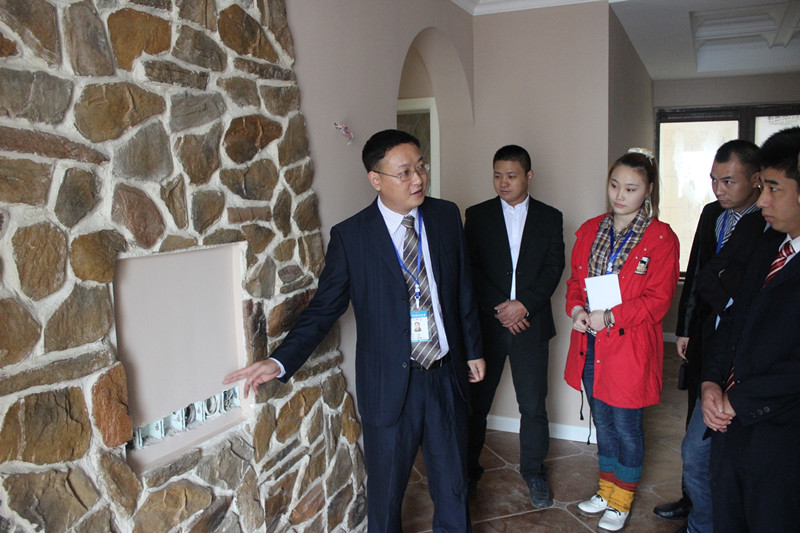 文经理正在向大家讲解电视墙施工细节